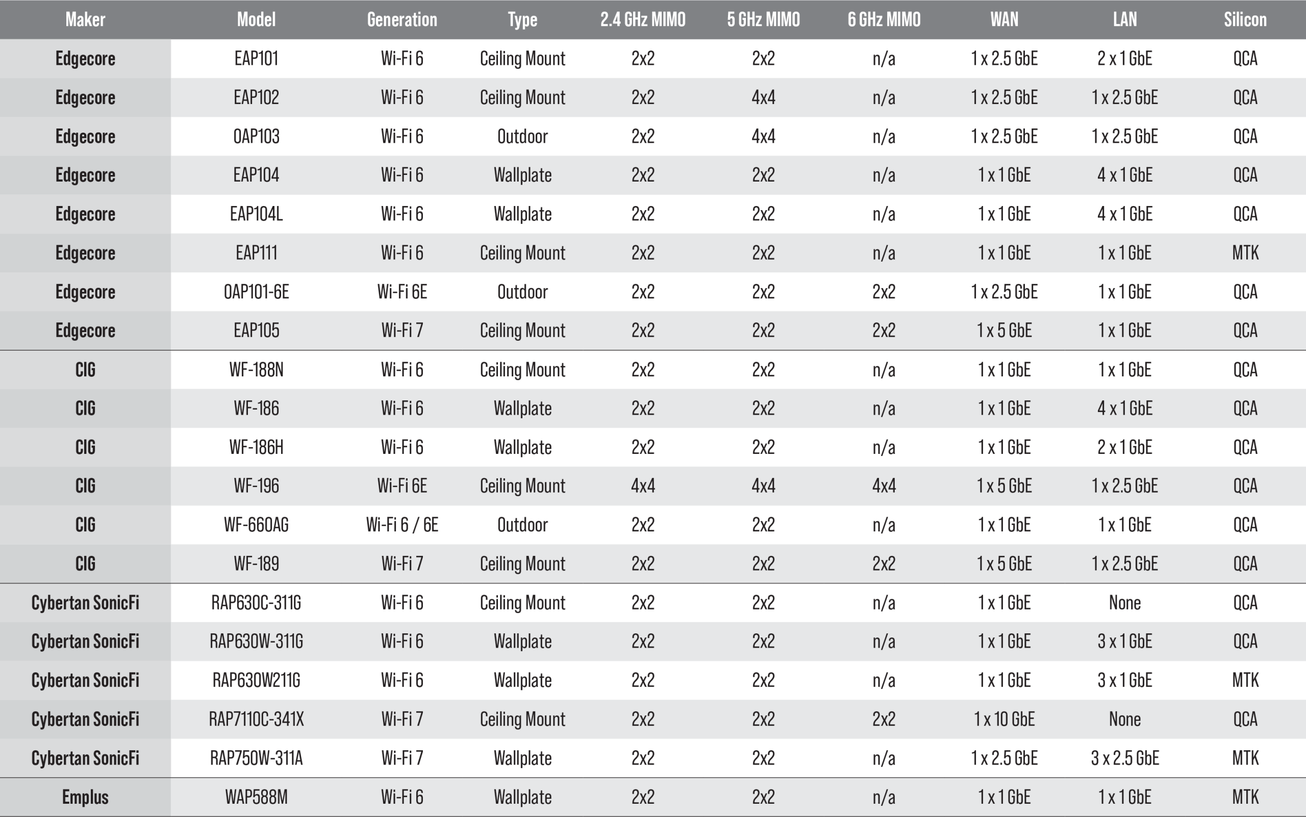- WiFi6 and WiFi6E wall plate, ceiling mount and outdoor Access Points available from multiple manufacturers