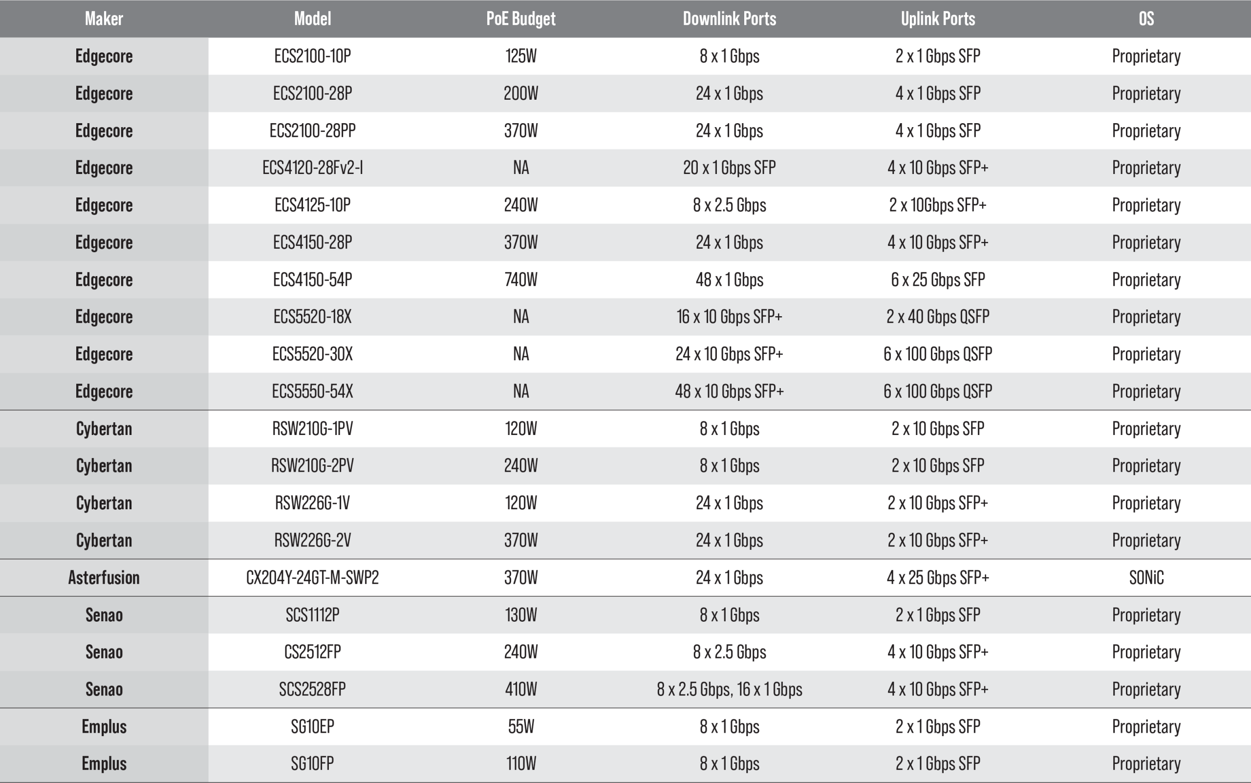 This table shows the currently supported OpenLAN switches from several hardware vendors. More switches are being added every quarter. Don’t hesitate to get in touch with us if you have a specific TIP-compatible switch that is not on this list that you require support for.